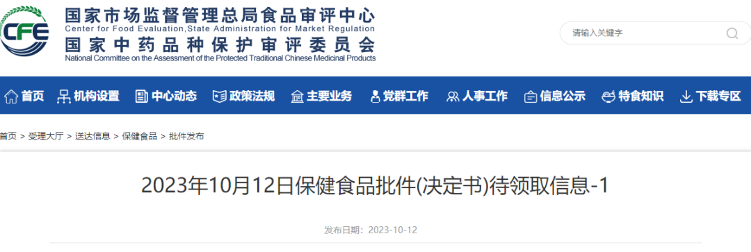 备注:证书领取可选择前台领取和邮寄方式。前台领取:需携带旧证书、委托书(加盖申请人公章)、委托人身份证原件及复印件。邮寄领取:需邮寄旧证书及加盖申请人公章的回邮说明,写明产品受理号,发布批次及序号,收件人姓名、联系电话、回寄公司名称和地址等信息,至国家市场监督管理总局食品审评中心受理大厅。