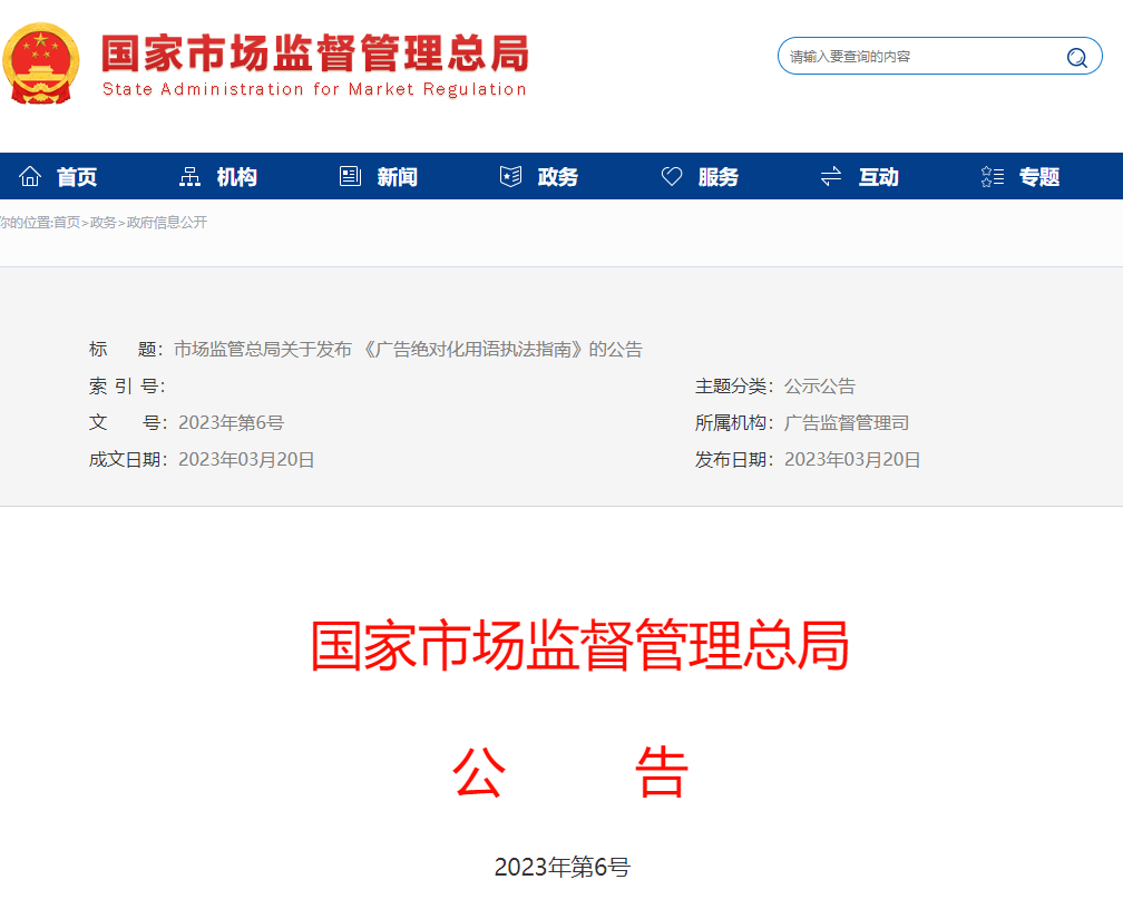 为进一步规范广告绝对化用语执法,保护自然人、法人和其他组织的合法权益,维护广告市场秩序,市场监管总局于近日发布《广告绝对化用语执法指南》(以下简称《指南》),为市场监管部门开展广告绝对化用语监管执法提供指引。