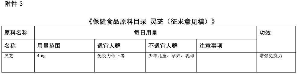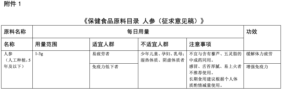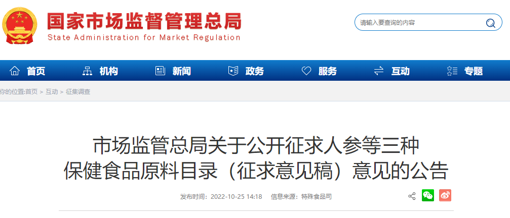为进一步推进保健食品备案工作,根据《中华人民共和国食品安全法》,市场监管总局组织制修订了人参等三种保健食品原料目录(征求意见稿),现面向社会公开征求意见,意见建议反馈截止时间为2022年11月25日。公众可以通过以下途径和方式提出意见建议: 一、登陆市场监管总局网站(网址:http://www.samr.gov.cn),通过首页“互动”栏目中的“征集调查”提出意见。 二、通过电子邮件将意见建议发送至:bjspba@cfe-samr.org.cn,邮件主题请注明“人参等三种保健食品原料目录(征求意见稿)公开征集意见”字样。 三、将意见建议邮寄至:北京市西城区北露园1号国家市场监督管理总局特殊食品司,并在信封上注明“人参等三种保健食品原料目录(征求意见稿)公开征集意见”字样。 附件:1.保健食品原料目录 人参(征求意见稿) 2.保健食品原料目录 西洋参(征求意见稿) 3.保健食品原料目录 灵芝(征求意见稿) 市场监管总局 2022年10月25日